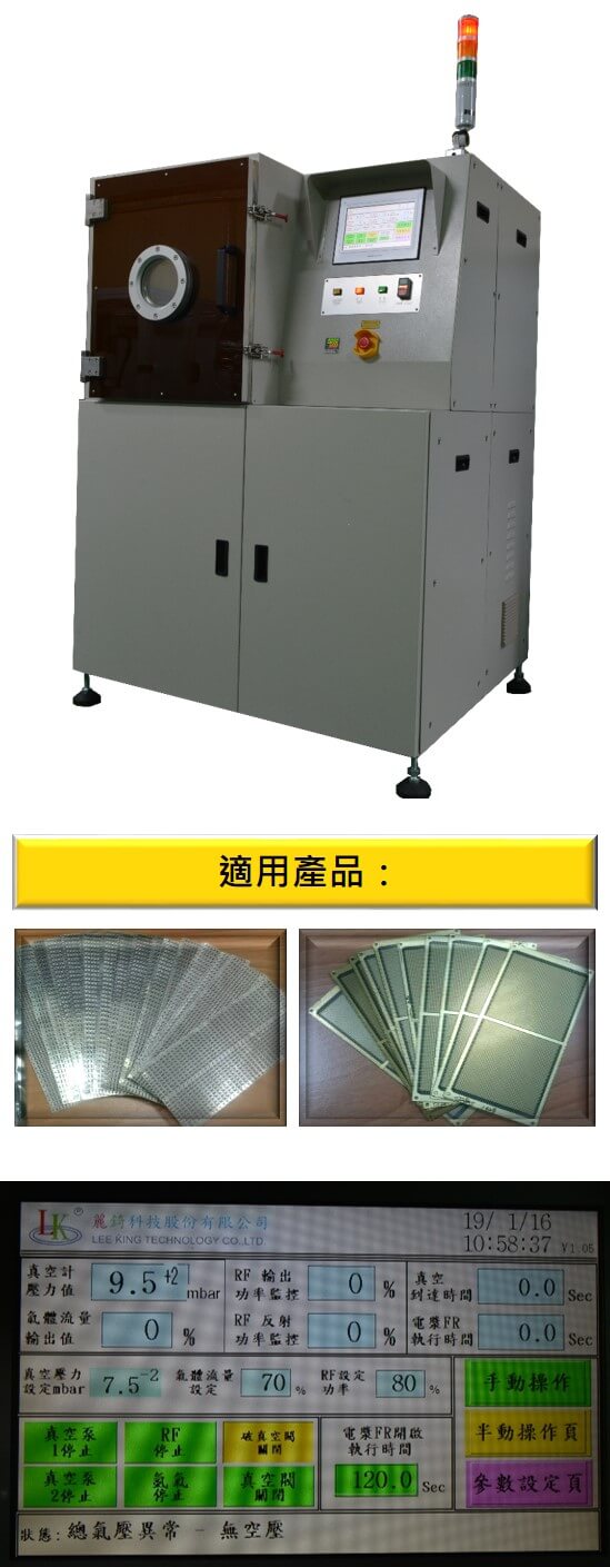 1. 電容式電極,使用RF電源供應。 2. 處理速度快、清潔效率高、可靠度高。 3. 在真空下改善產品表面潔淨度與有有機物的污染。 4. 改善元件連結的強度與可靠性,提升良率並降低製造成本。 5. 簡單的操作介面 6. 腔體式設計,清洗數量較多 |